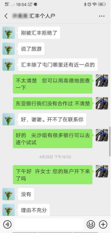 許女士在4月29日上午自己去香港花費(fèi)一上午的時(shí)間找了匯豐、恒生等多家銀行都沒開下來賬戶,銀行拒絕開戶的理由各種各樣,如開戶理由不足、缺少開戶資料或是要求買高額理財(cái)才能受理開戶,這時(shí)許女士通過網(wǎng)絡(luò)找到了我們新晟國(guó)際。